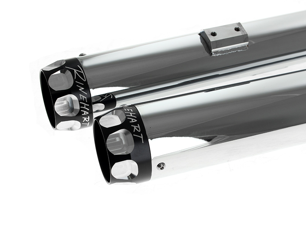 RINEHART EXHAUST 3in. Slip-On Mufflers – Chrome with Black Scalloped End Caps. Fits Softail Deuce 2007 & Fat Boy 2007-2017
